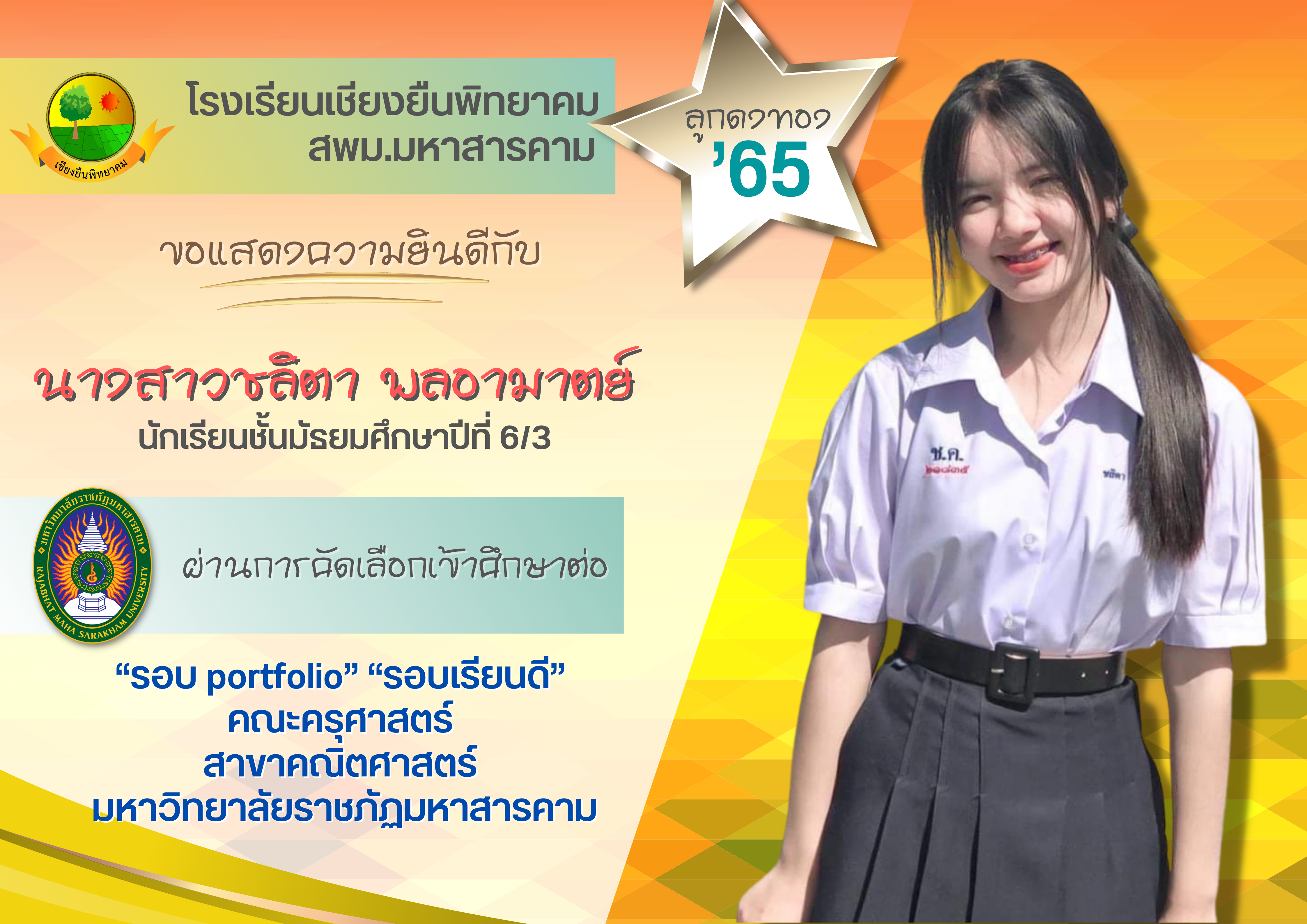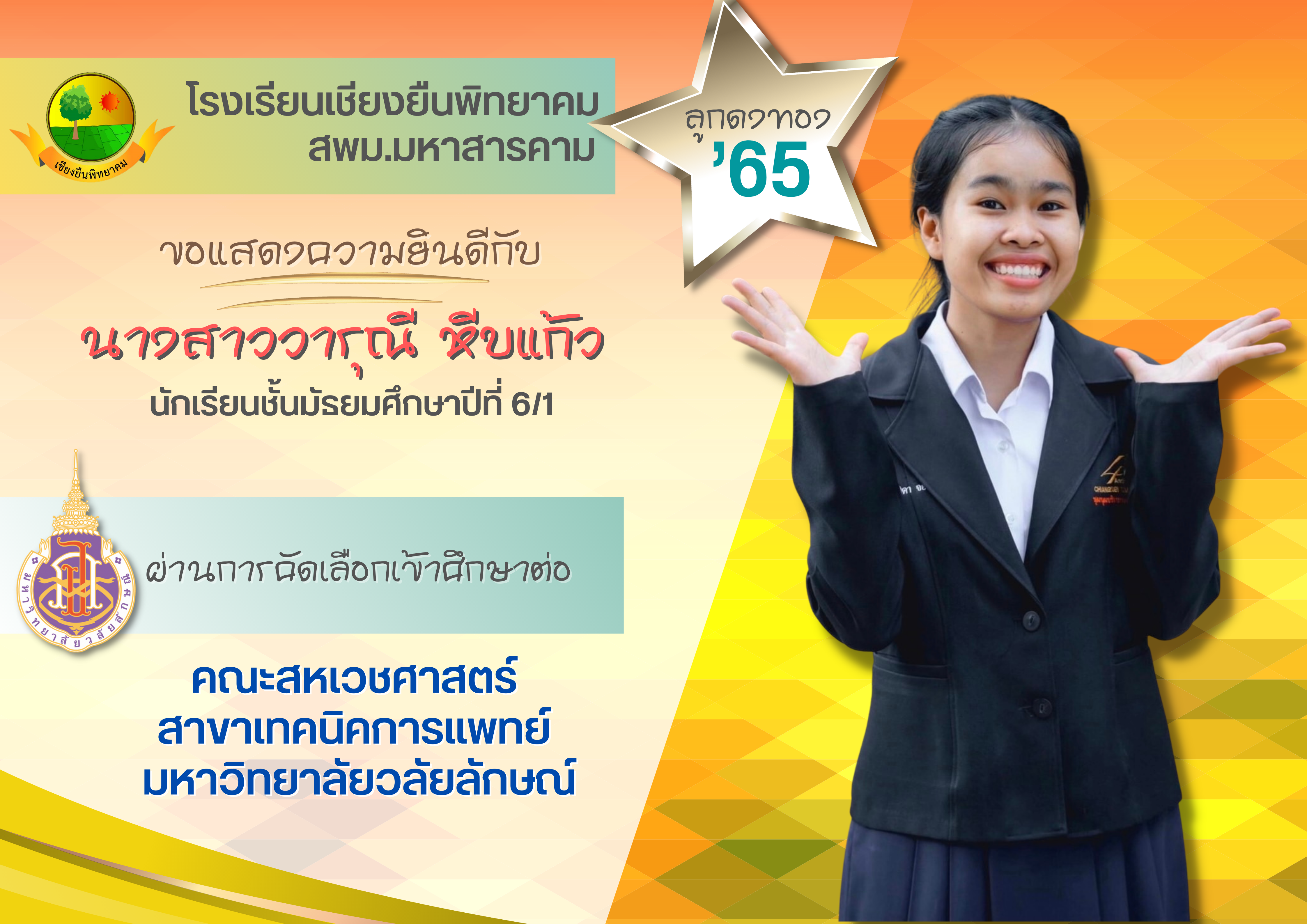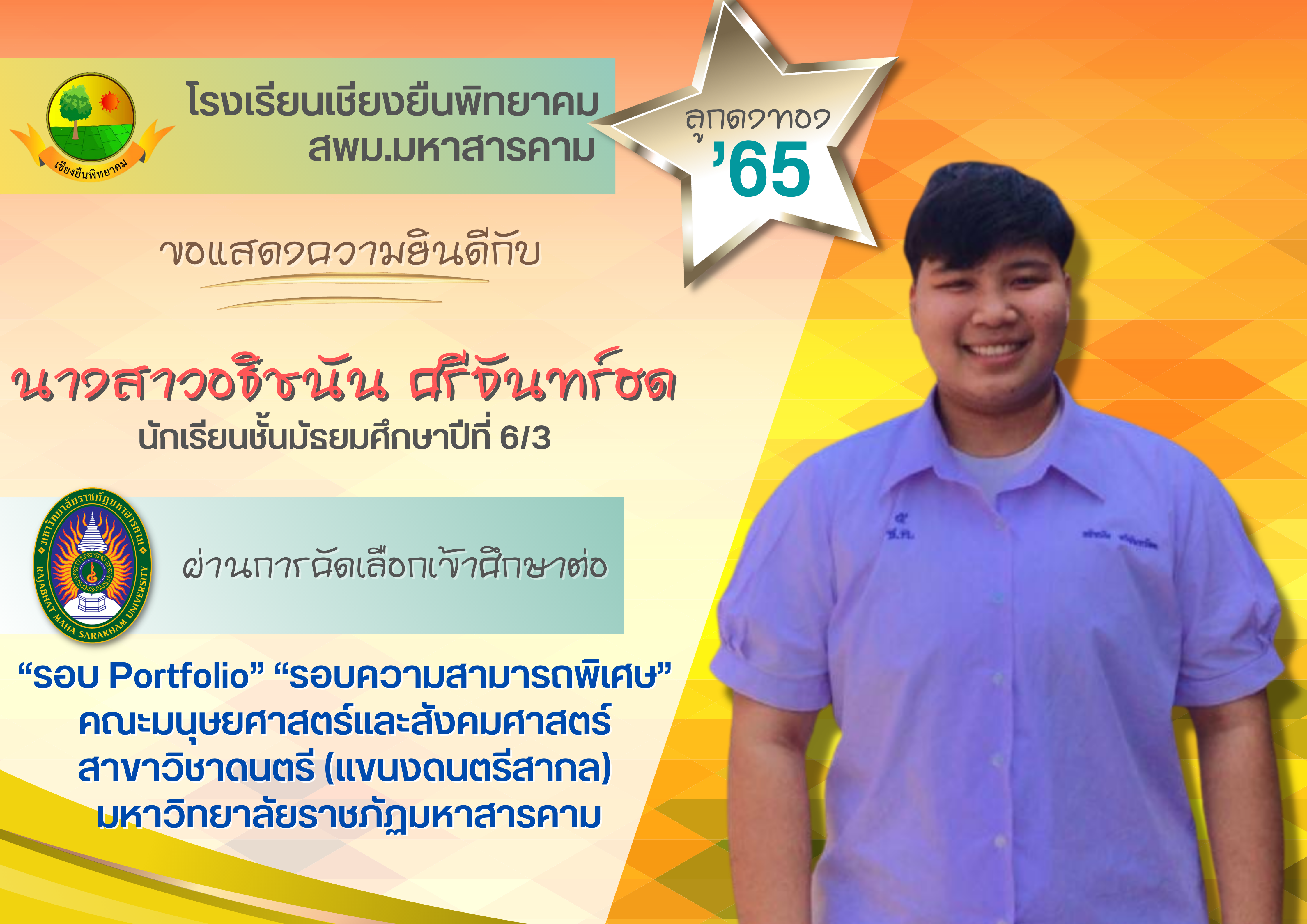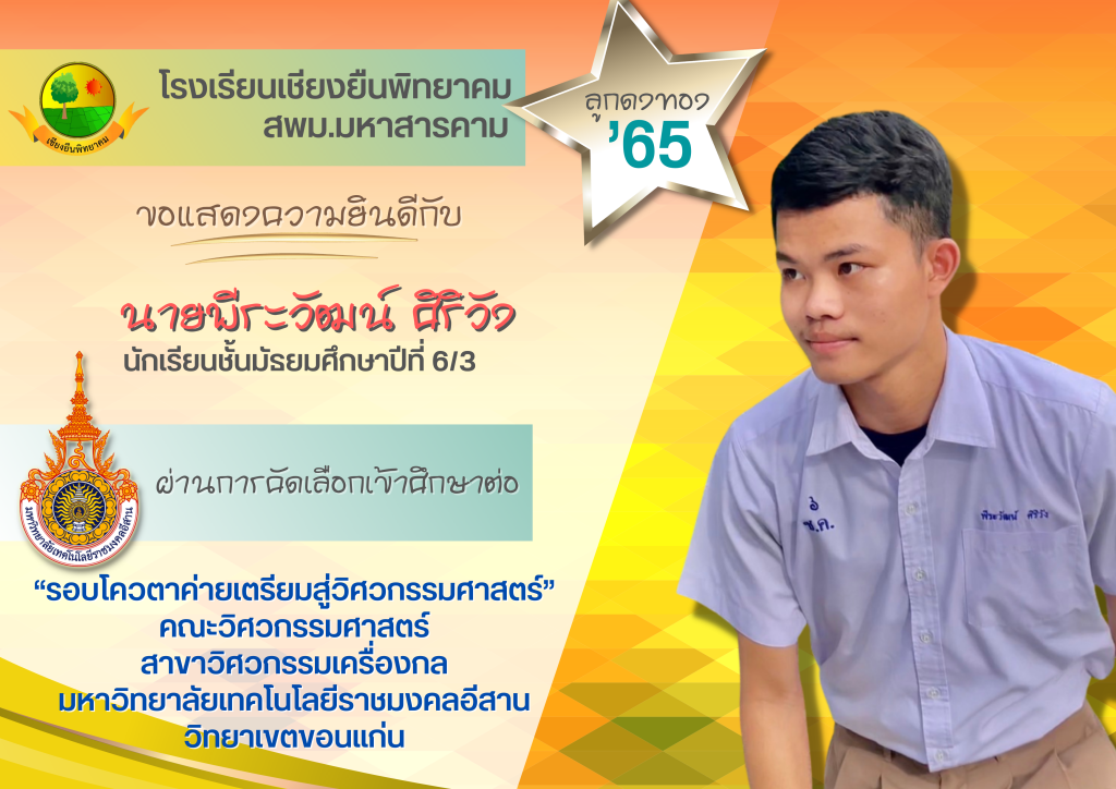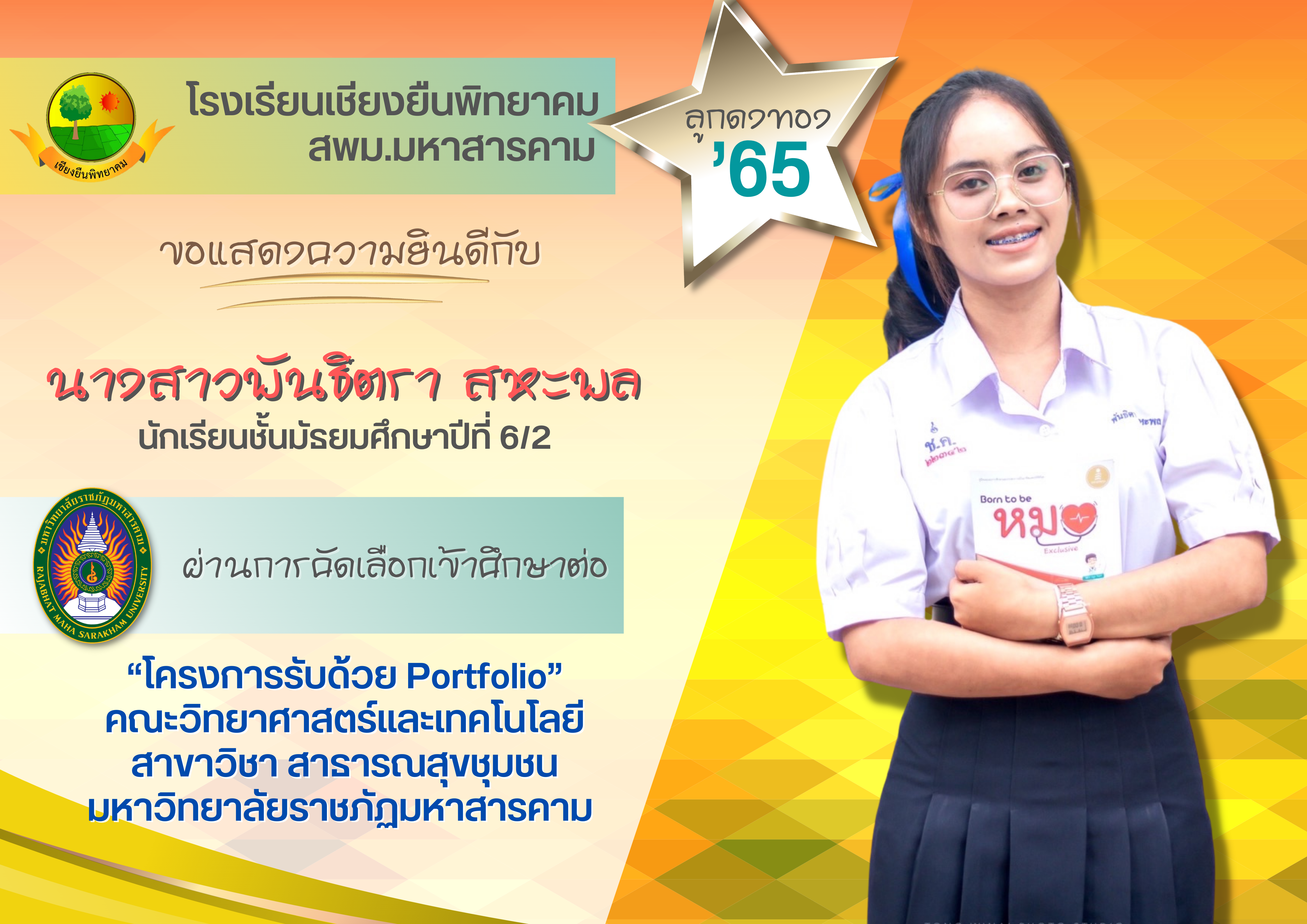 ขอแสดงความยินดี กับนักเรียนชั้นมัธยมศึกษาปีที่ 6 ปีการศึกษา 2565 ที่ผ่านการคัดเลือกเข้าศึกษาต่อในระดับอุดมศึกษา