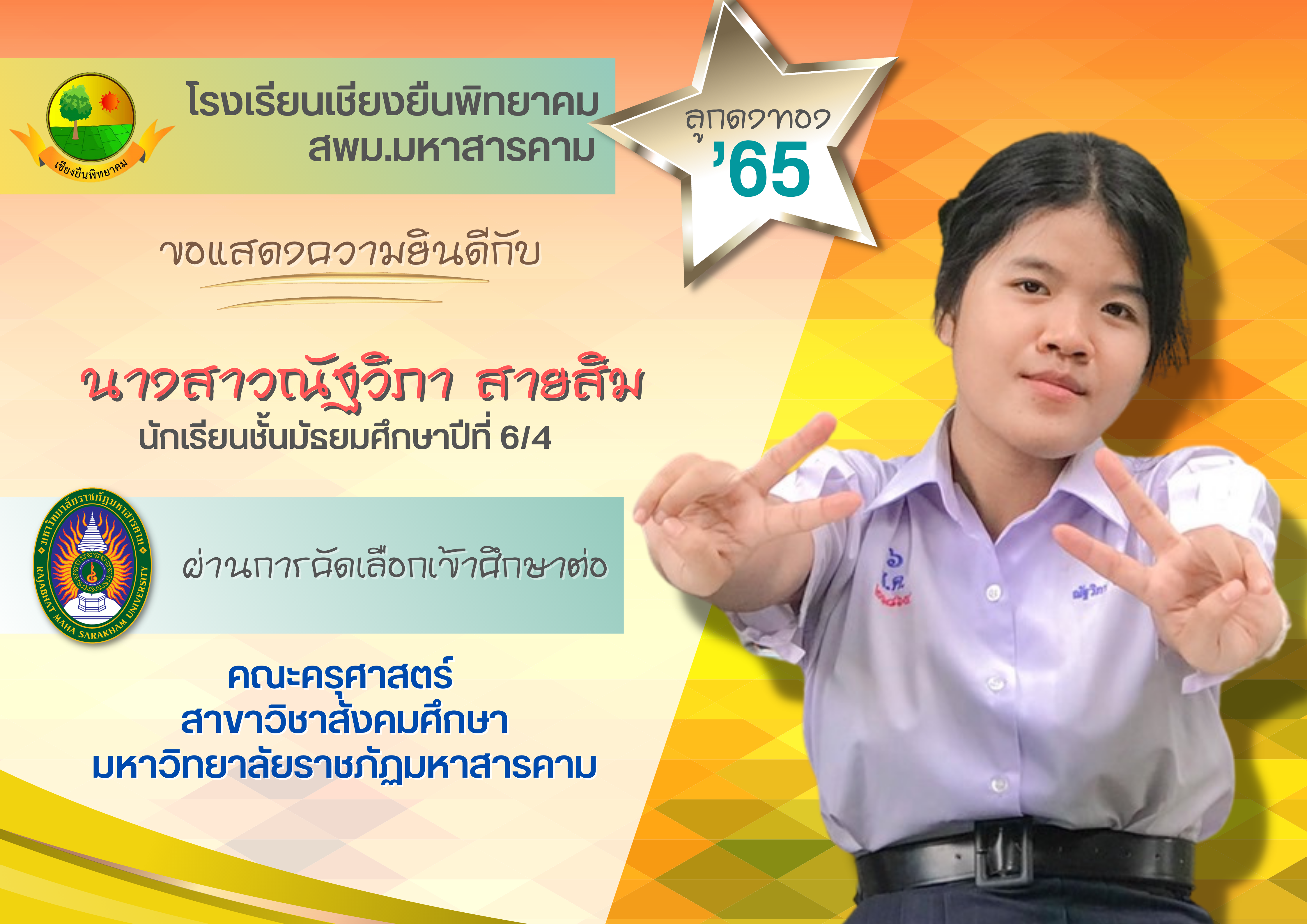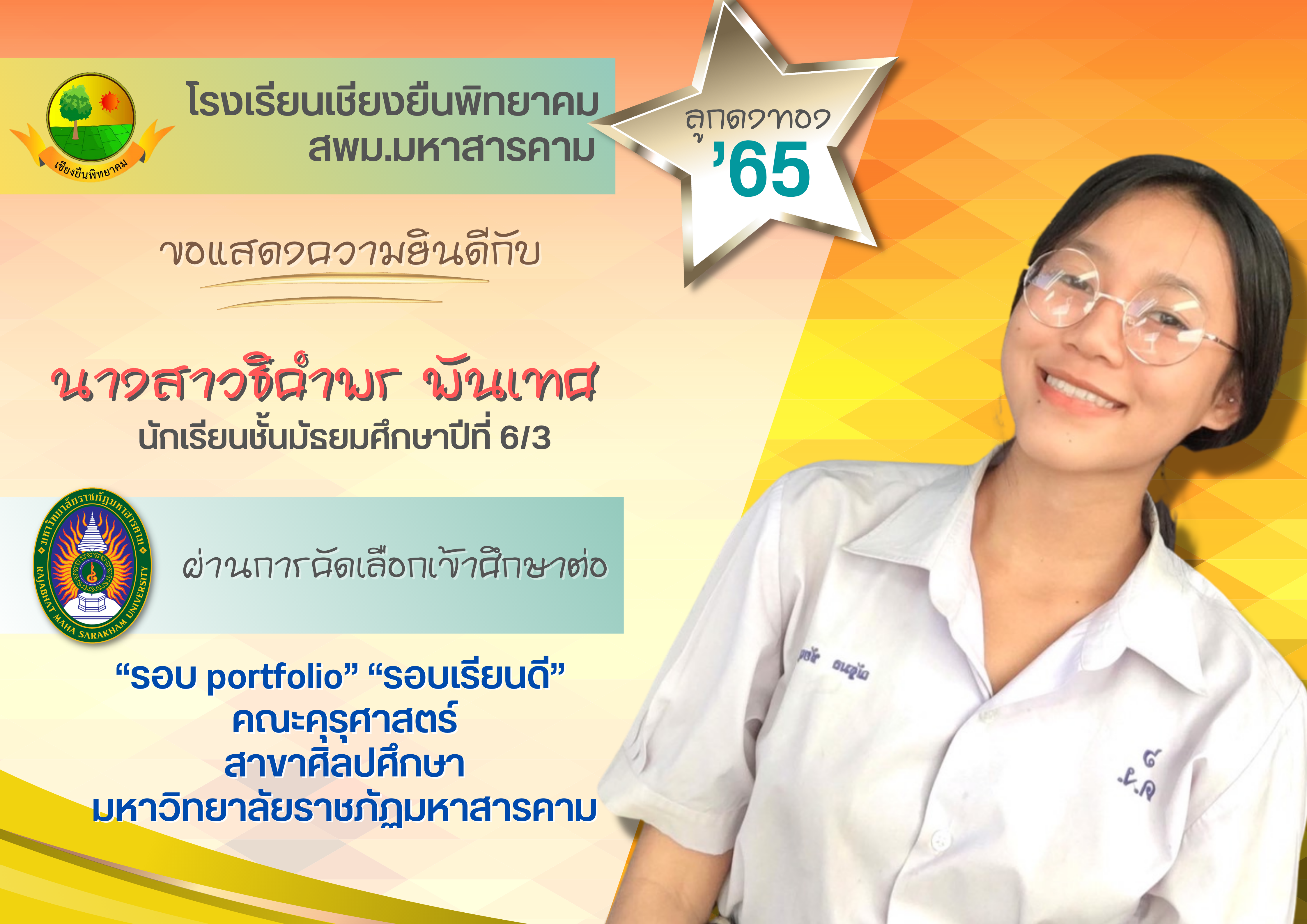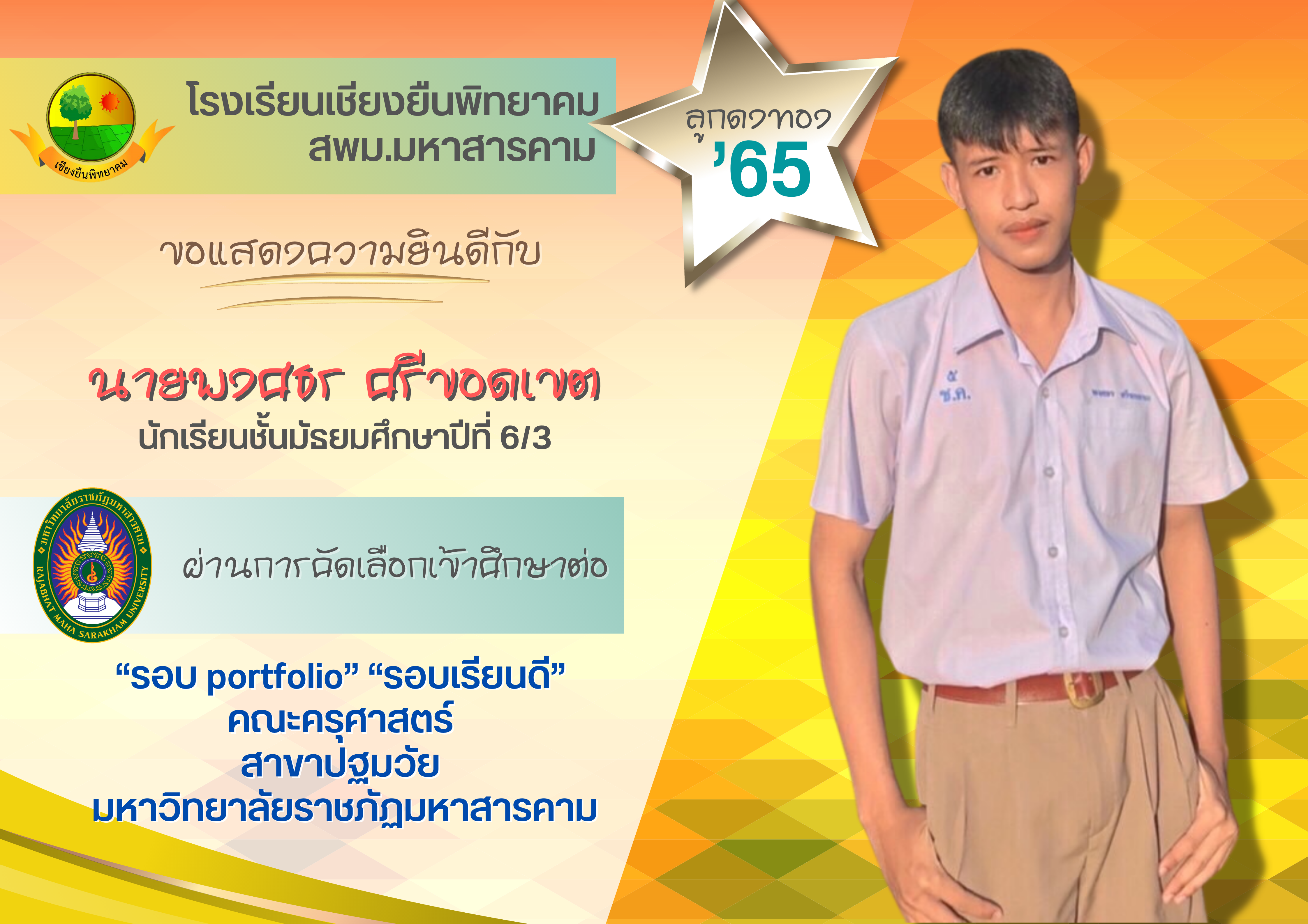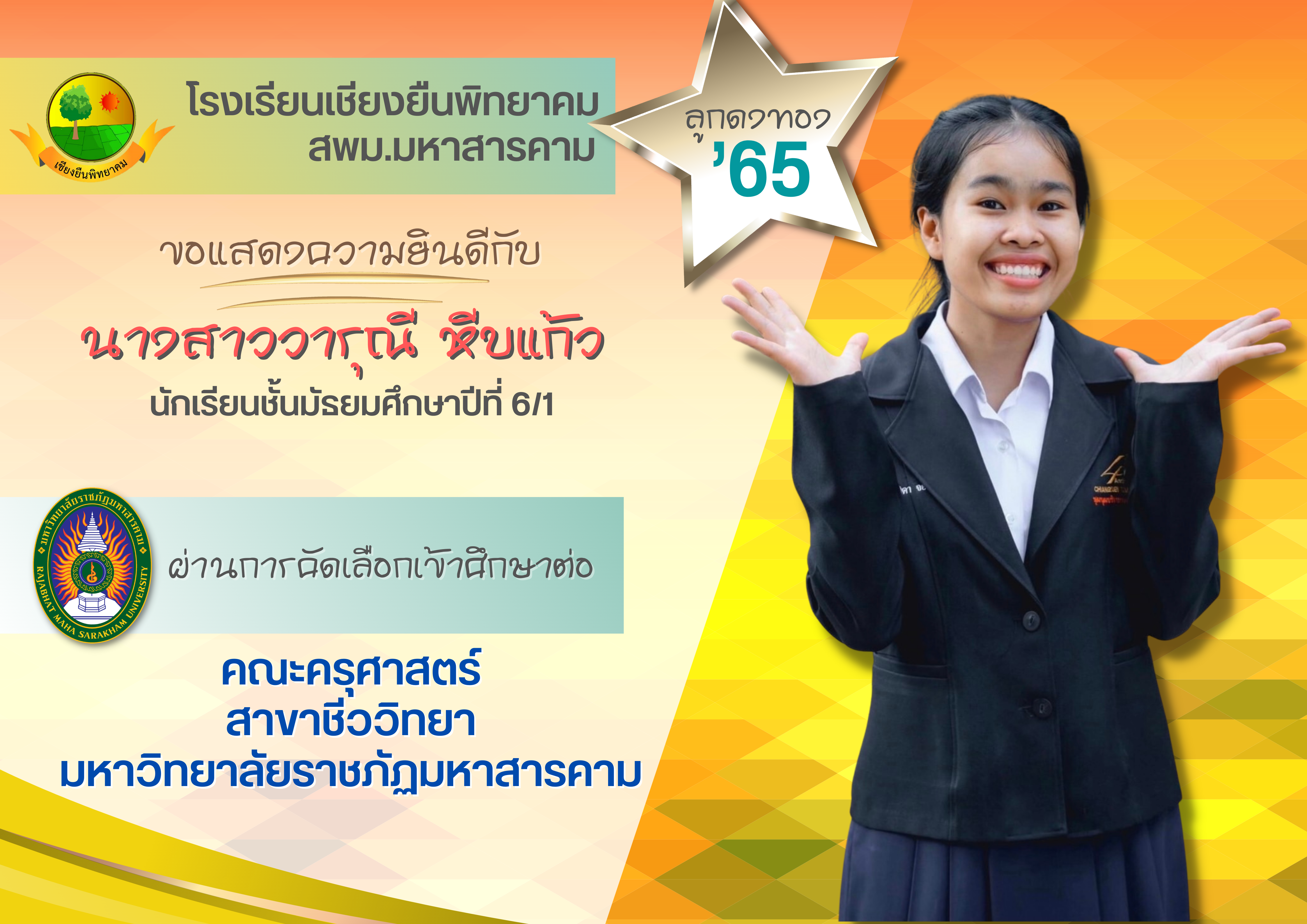ขอแสดงความยินดี กับนักเรียนชั้นมัธยมศึกษาปีที่ 6 ปีการศึกษา 2565 ที่ผ่านการคัดเลือกเข้าศึกษาต่อในระดับอุดมศึกษา