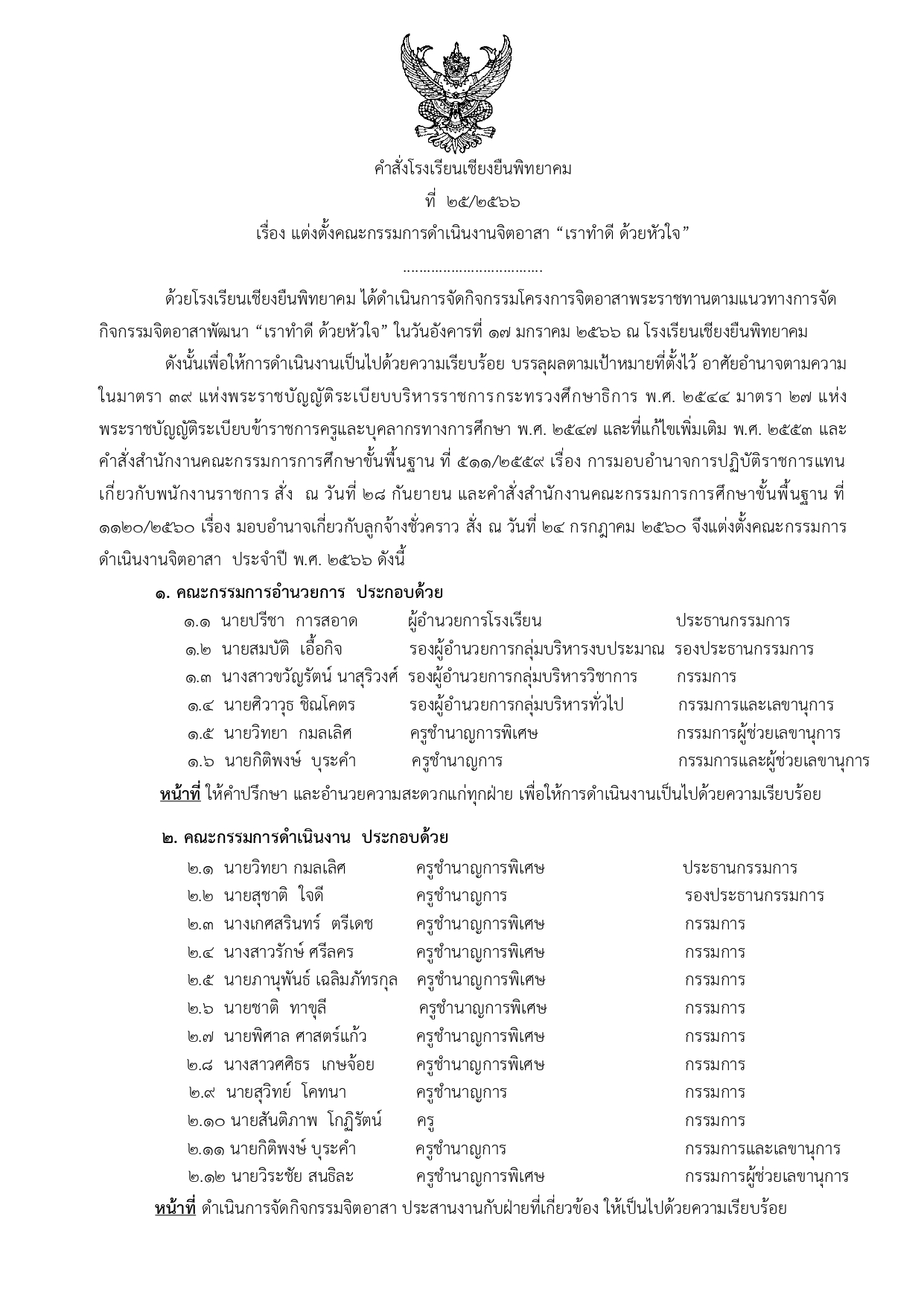 คำสั่งโรงเรียนเชียงยืนพิทยาคมที่ 25/2566 เรื่อง แต่งตั้งคณะกรรมการดำเนินงานจิตอาสา “เราทำความดี ด้วยหัวใจ” Admin 13/01/2023 ข่าว/ประกาศ, คำสั่งกลุ่มบริหารทั่วไป Leave a comment 727 Views