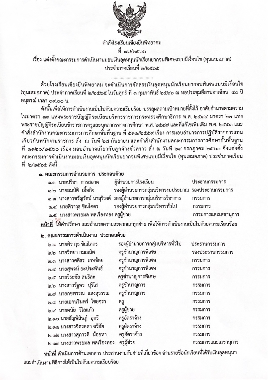 คำสั่งโรงเรียนเชียงยืนพิทยาคมที่ 77/2566 แต่งตั้งคณะกรรมการดำเนินงานมอบเงินอุดหนุนนักเรียนยากจนพิเศษแบบมีเงื่อนไข (นักเรียนทุนเสมอภาค) ประจำภาคเรียนที่ 2/2565 Admin 01/02/2023 ข่าว/ประกาศ, คำสั่งกลุ่มบริหารทั่วไป Leave a comment 491 Views