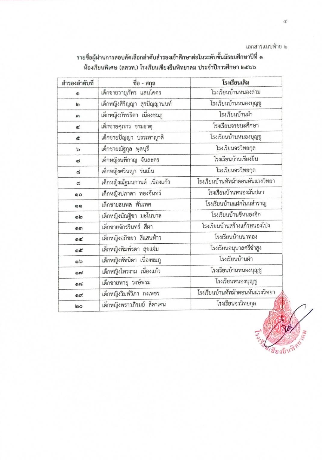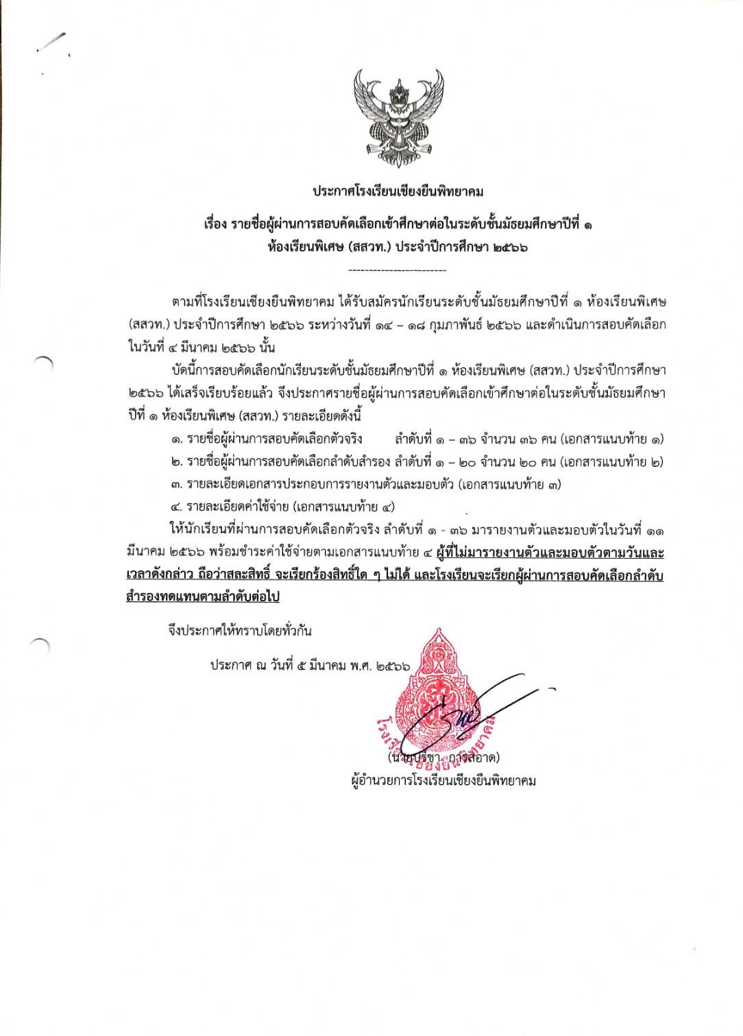 ประกาศโรงเรียนเชียงยืนพิทยาคม เรื่อง รายชื่อผู้ผ่านการสอบคัดเลือกเข้าศึกษาต่อในระดับชั้นมัธยมศึกษาปีที่ 1 ห้องเรียนพิเศษ (สสวท.) ประจำปีการศึกษา 2566