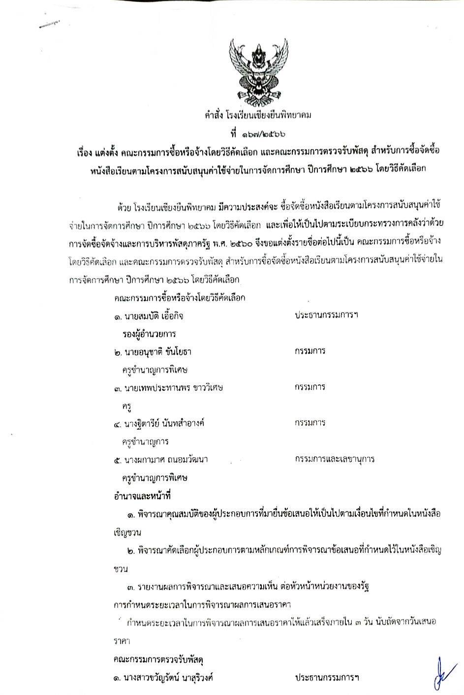 คำสั่งโรงเชียงยืนพิทยาคม ที่ 167/2566 เรื่อง แต่งตั้งคณะกรรมการซื้อหรือจ้างโดยวิธีคัดเลือก และคณะกรรมการตรวจรับพัสดุ สำหรับการซื้อจัดซื้อหนังสือเรียนตามโครงการสนับสนุนค่าใช้จ่ายในการจัดการศึกษา ปีการศึกษา 2566 โดยวิธีคัดเลือก